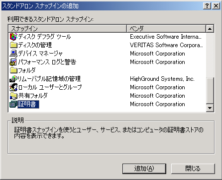 をクリックし、[スタンドアロンスナップイン]の追加画面を閉じます。